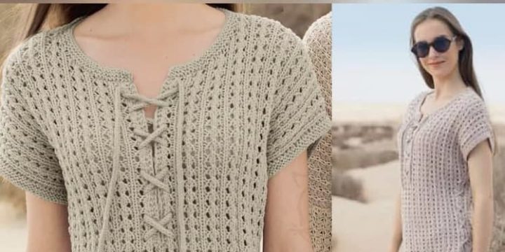 Пуловер со с шнуровкой у горловины спицами. Летний пуловер спицами из льна