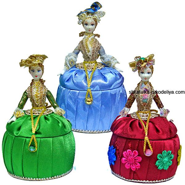 Каждая кукла-шкатулка уникальна и неповторима, поскольку сделана только вручную. Каждый образ имеет свою изюминку, которая отличает изделия между собой. Чаще всего рукодельницы наряжают куклу в длинное изящное платье с несколькими ярусами рюш. Пышные рюши скрывают под собой потайную шкатулочку. Куколка может иметь мечтательный и романтичный образ, а может излучать некоторую аристократичность.