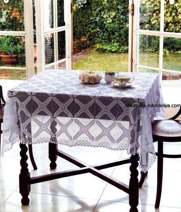 Квадратная скатерть крючком. Филейная кружевная скатерть вязаная мотивами.