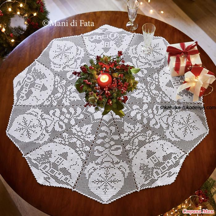 Рождественская салфетка крючком в технике филейного вязания. Круглая салфетка кружевным узором схемы
