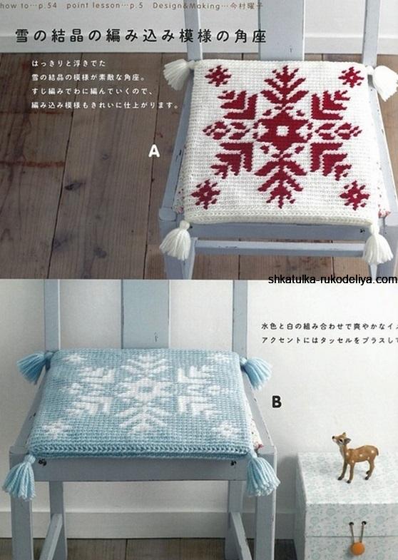 Схема вязания квадратных и круглых ковриков-сидушек с узором снежинки. Жаккардовый коврик крючком для стула