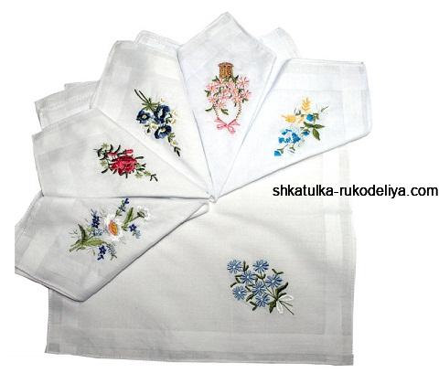 Вы можете создать в центральной части платка основную композицию, вышить смысловые растяжки к уголкам и в одном из уголков вышить красивые инициалы, которые сделают ваше изделие поистине уникальным! Например, по центру вышиваете крупный бутон розы, от нее в сторону уголков идут листочки не очень большие, чтобы не перегружать рисунок и не перетягивать с розы основное внимание. По краю платка идут молодые веточки с гроздьями мелких цветов, тут сорт и вид цветочков на выбор и мастерство рукодельницы. И в одном уголке в завершение – надпись с инициалами. Если вы собираетесь сделать подарок, носовые платки, вышитые специально для человека – идеальный подарок. И пусть вас не смущает примета, что дарить платки к печали и слезам, можно ведь взять символическую плату (хоть 5 копеек) и действие приметы рассыплется в пыль. Вышитый платок с инициалами, обвязанный по контуру крючком, добавит восхищения мастерице и завистливых взглядов обладателю.