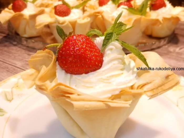 Приготованим кремом наповніть кошики. Доповніть кожну порцію полуничкою (до речі, це можуть бути будь-які сезонні ягоди або фрукти), і за бажання декоруйте листочками м’яти (меліси).