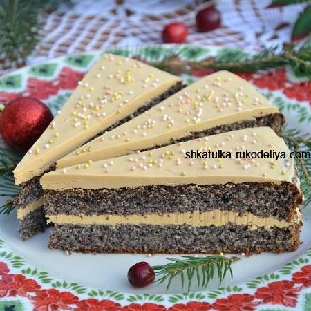 В подходящую емкость переложите размягченное масло и далее, постоянно мешая, добавляйте по 1-й столовой ложке ириски до полного использования и объединения компонентов. Полученную крем-массу разделите на две части и, перемазав ею маковые коржи, соберите торт. Сверху при желании торт можно украсить декоративной посыпкой.