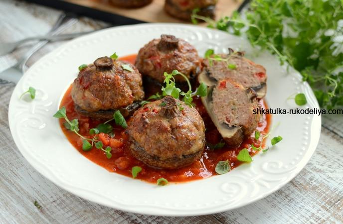 Чудова обідня страва – гриби, фаршировані м’ясним фаршем, запечені в томатному соусі. Завдяки спільному запіканню одночасно грибів і фаршу аромати більш щілно проникають один в одного, а сам фарш виходить дуже соковитим. Приготовлені таким чином гриби добре поєднуються з домашнім томатним соусом. Їх можна їсти гарячими або холодними, з різними гарнірами, приміром, чудово в дуеті поводитимуться рис або картопля, а можна просто із духм’яним свіжим хлібом. А ще такі гриби припадуть до смаку не тільки за звичайним обідом, а і до святкового столу.
