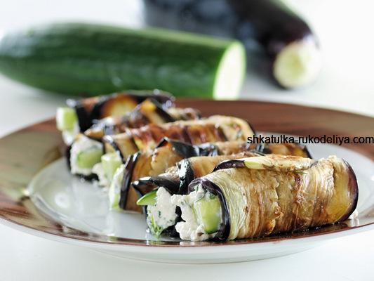Ложкою викладіть начинку на остиглі скибочки баклажанів, зверху покладіть огірок і скрутіть кожну скибочку баклажана рулетом. Кінець рулету можна закріпити дерев’яною паличкою.