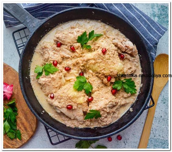Смысловое отступление: говоря в двух словах «САЦИВИ» – это название непосредственно соуса. А само блюдо с одноименным названием представляет собой залитое и выдержанное в нем мясо. А посему мясо можно заливать соусом сначала в рабочей, так сказать емкости, выдержать и переложить в презентационную посуду. А можно сразу готовить в блюде для подачи. Сегодня остановимся на втором варианте.