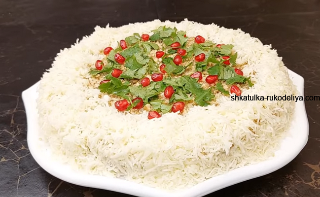 К слову сказать, в процессе приготовления можно было оставить один отварной белок как раз для украшения и натерев его на мелкой терке, создать белоснежную окантовку по краю. А центр припорошить мелко порубленой зеленью (самой ее малостью) и несколькими зернами граната. Вы же в вопросе декора можете положиться на собственную фантазию и предпочтение к тем или иным компонентам.
