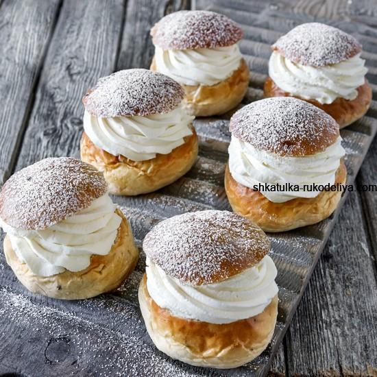 Вільну порожнину в кожній булочці наповніть мигдальною начинкою. Зверху по краю видавіть із кондитерського мішка збиті вершки. І покладіть зверху капелюшки. А безпосередньо перед подачею посипте цукровою пудрою.