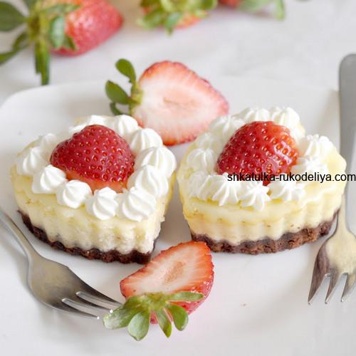 Перед подачею на стіл збийте вершки з цукровою пудрою. За бажанням додайте молочну суміш. Це допоможе стабілізувати вершки і зробити їх більш стійкими. Покладіть на кожен чізкейк половинку полуниці. За бажанням ягідні часточки можна вирізати теж у формі серця. І прикрашаємо навколо збитими вершками.