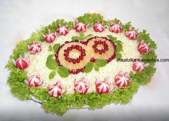Декоруйте салат як вам підкаже власна фантазія. Наприклад, можна вибрати для декору пару ананасових кілець і жменю зерен граната, що лише приємно доповнить смакову палітру страви.