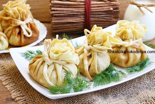 Отже, млинець покласти на тарілку. На середину млинця викласти столову ложку начинки. Посипати тертим сиром. Після чого зібрати краї млинця вгору, утворюючи мішечок. Зв’язати його стрілкою зеленої цибулі або сиром чечіл, який потрібно розплести, щоб отримати довгу “мотузочку” з сиру.