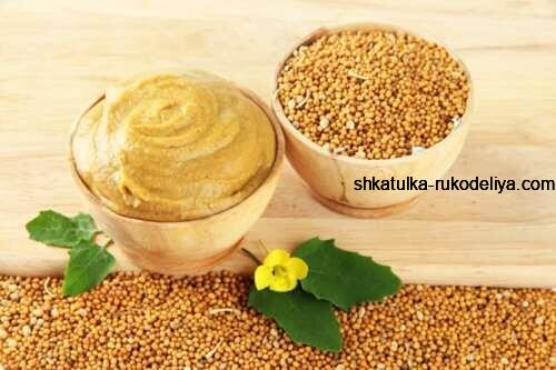 Возьмите 2 столовые ложки горчичного порошка, смешайте с 2 чайными ложками сахара, залейте 2 столовыми ложками кипятка и старательно все перемешайте. К полученной смеси вбейте 1 яичный желток и введите 2 столовые ложки оливкового масла. Еще раз окончательно промешайте. Готово!