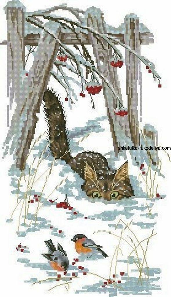 вышивка крестиком, бесплатная схема, кот, птички, своими руками