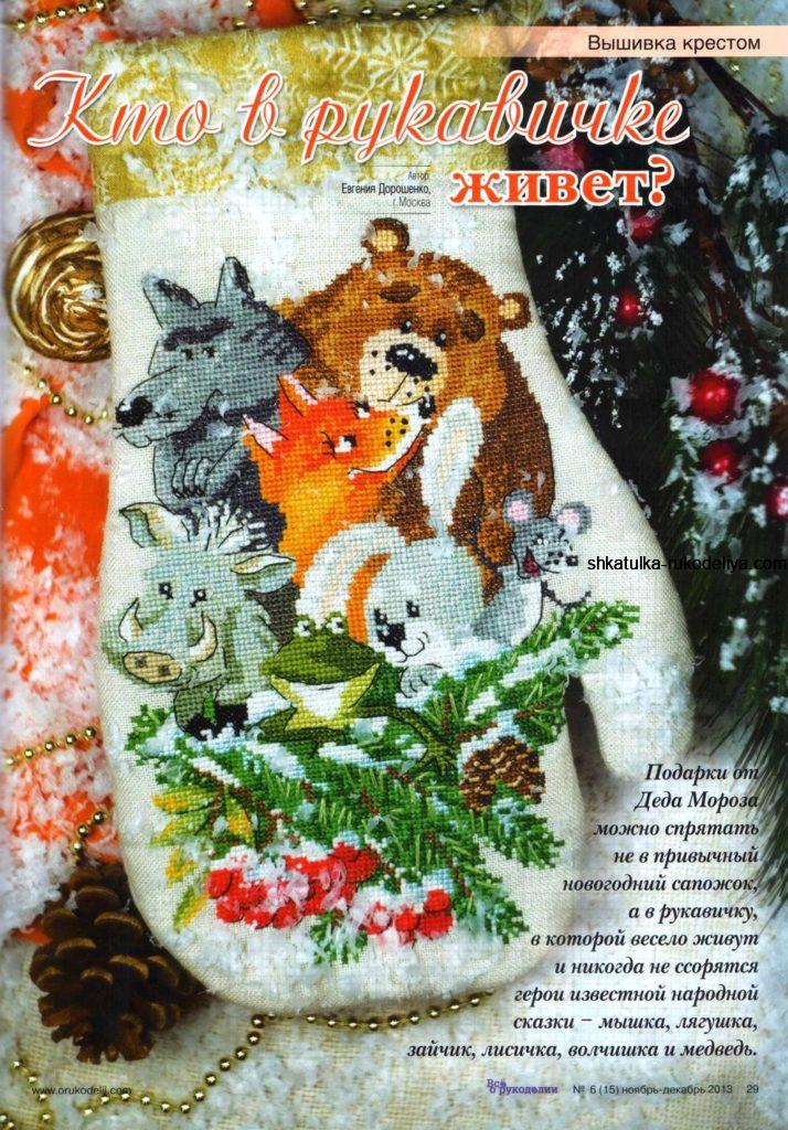 Вышивка крестиком Кто в рукавичке живет. Отличная идея где можно спрятать подарки от Деда Мороза. Это еще может быть оригинальная прихватка на кухню.