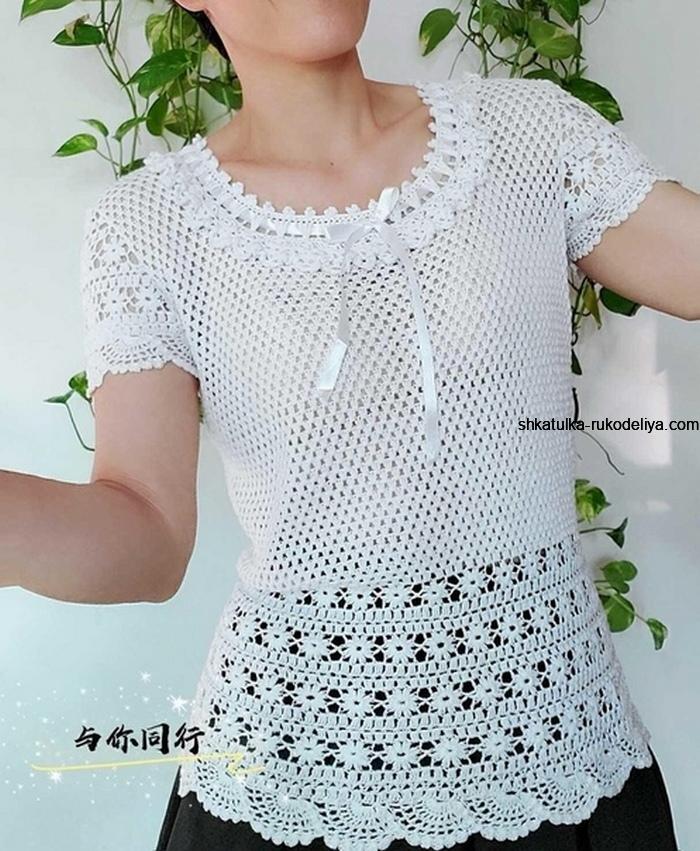 вязание крючком, блуза, схемы, женская, лето, ажурная, белая, короткий рукав