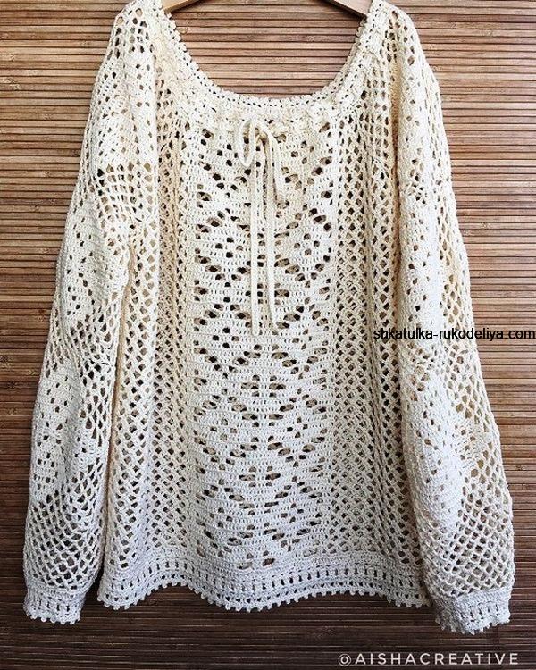 вязание крючком, пуловер, белый, схема, описание, Aisha Creative, ручная работа, женский, длинный рукав