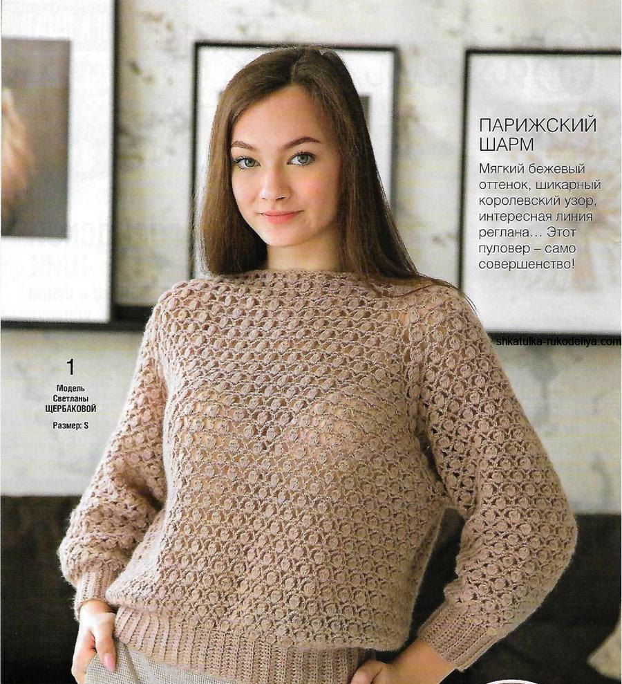 Бежевый пуловер крючком с интересной линией реглана. Стильный пуловер французский реглан вязание крючком