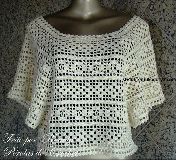 Блуза филейной техникой крючком. Свободная блуза с рукавом летучая мышь