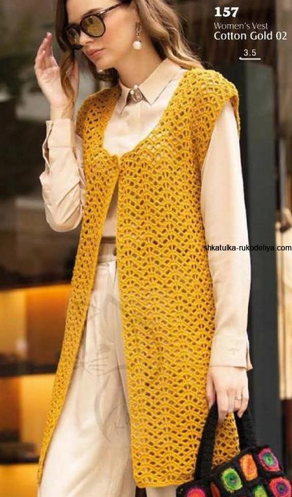 вязание крючком, жилет, схемы, женский, лето, узор зиг-заг, длинный, новая модель