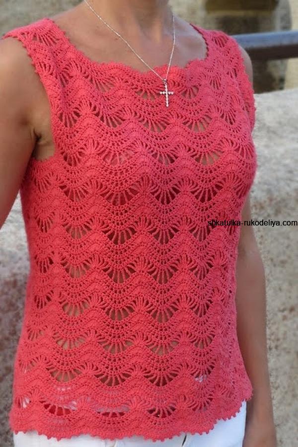 вязание крючком, топ, схемы, узор зигзаг, лето, коралловый, японский журнал
