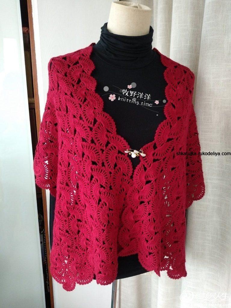вязание крючком, палантин, схема, ленточное кружево, красный, женский, ажурный