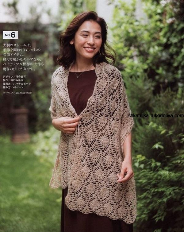 вязание крючком, палантин, схема, ананасовый, японская модель, воздушный, женский, 2020