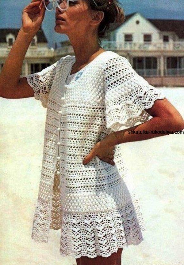 Пляжный халат вязаный крючком. Ажурный белый халат для пляжа