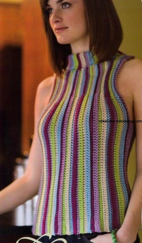 вязание крючком, топ, разноцветный, воротник стойка, описание, женский, летний, в полоску