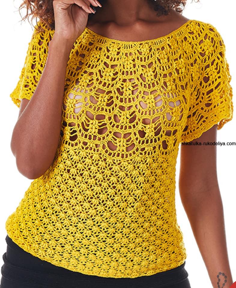 вязание крючком, топ, летний, женский, желтый, схема, описание, из хлопка