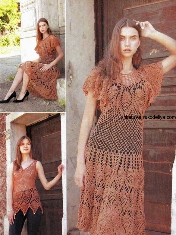 Ажурное платье с узором ананас крючком. Женское платье крючком на круглой кокетке