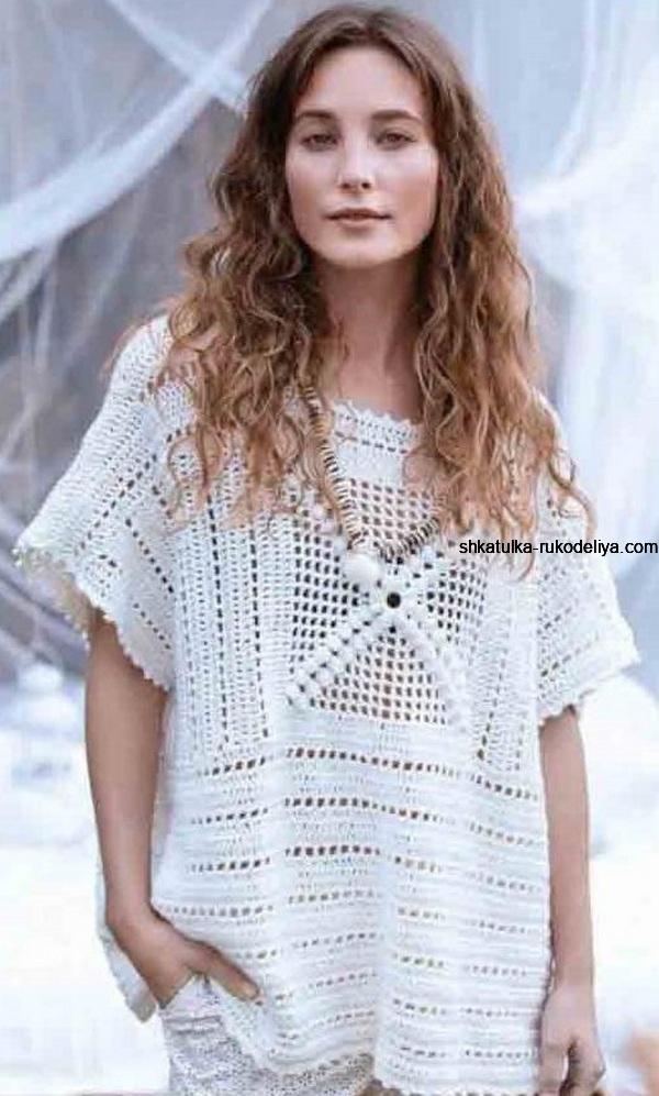Белая туника на основе квадрата крючком. Красивая туника в технике филейного вязания