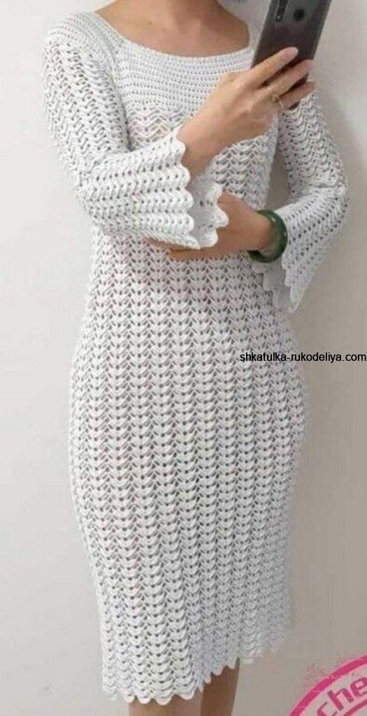 вязание крючком, платье, белое, схема, описание, узор веера, обьемный узор, женское