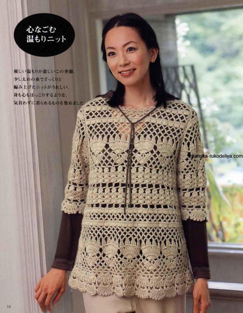 вязание крючком, туника, японская модель, цветочки, схема, женская, лето, бежевая