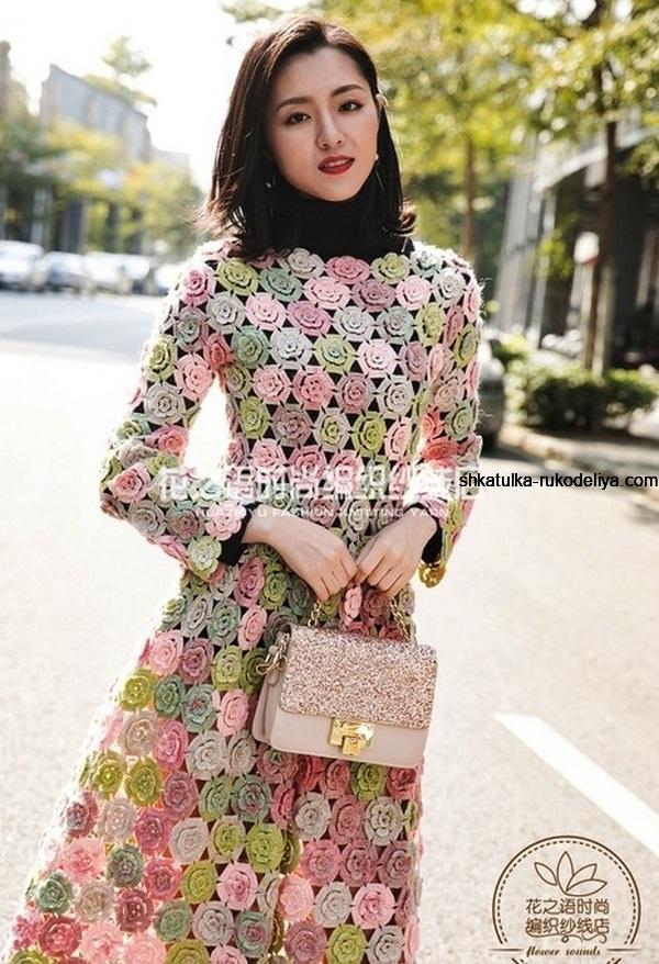 Платье цветочными мотивами крючком. Ажурный узор для вязания летнее платья крючком
