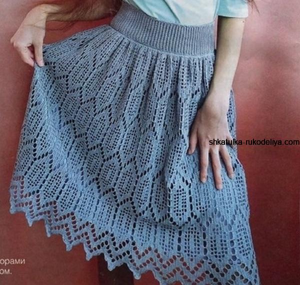 Серая юбка в филейной технике крючком. Ажурная юбка с широкой резинкой крючком