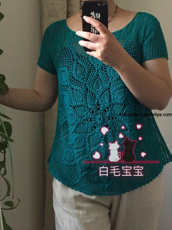 вязание крючком, туника, схема, женская, летняя, узор ананас, японская модель, короткий рукав