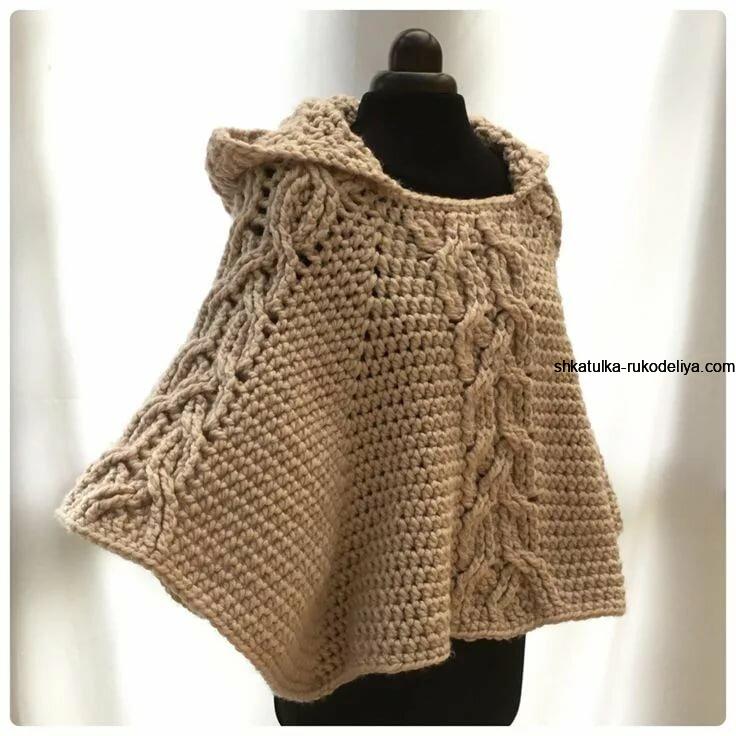 Теплое пончо с рельефными косами крючком. Пончо крючком из толстой пряжи для осенних прогулок