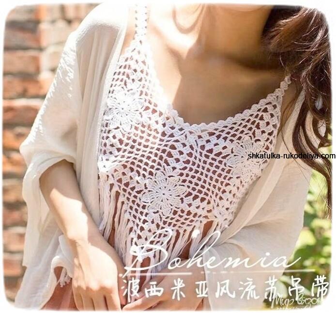 Топ крючком из квадратных мотивов. Летний женский топ с бахрамой схемы