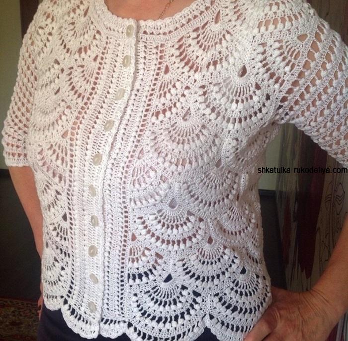 вязание крючком, жакет, схема, белый, узор ракушка, женский, короткий рукав