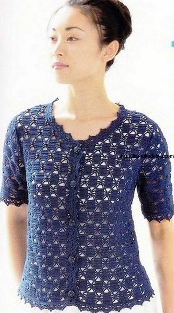 вязание крючком, жакет, женский, летний, короткий рукав, схема, на пуговицах, узор паучки