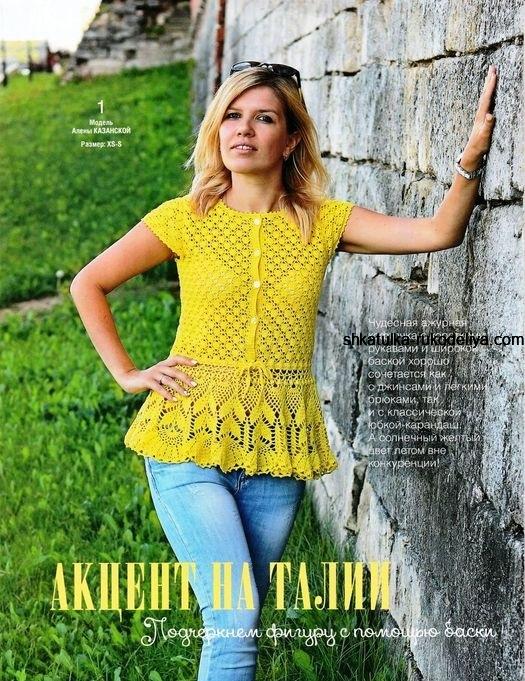 Желтый топ с баской крючком. Летний топ с описанием и схемами крючком. Кофта крючком с баской схемы