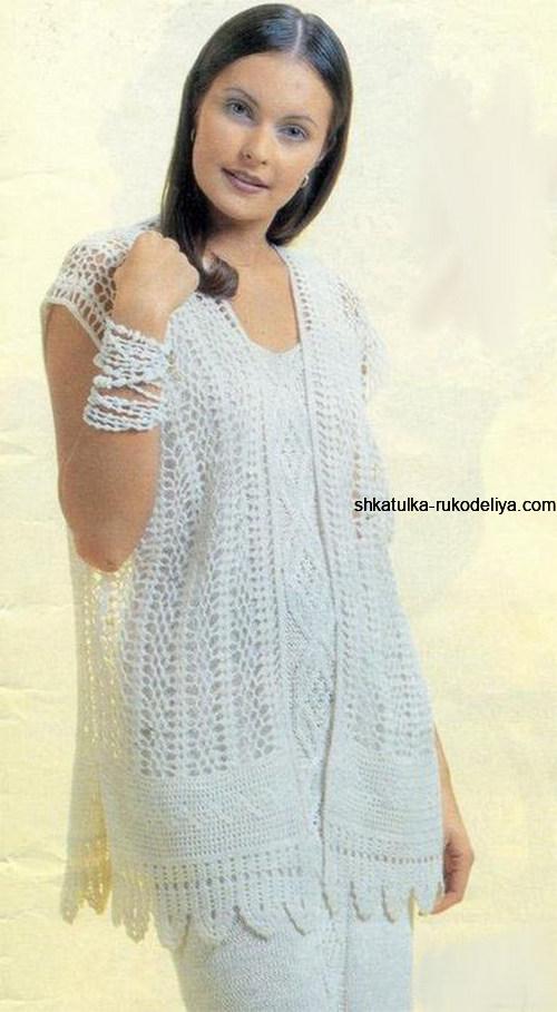 вязание крючком, жилет, схемы, описание, женский, длинный, ажурный, зубчатая кайма, лето