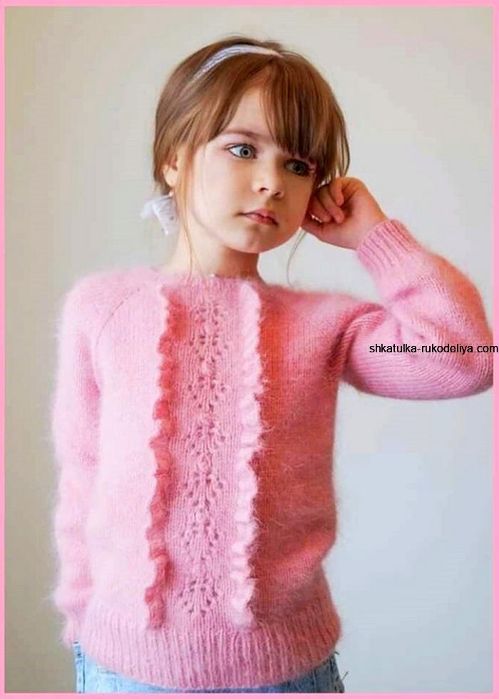 Джемпер для девочки из пуха норки с рюшами по переду. Автор Елена (@shkepu_ в инстаграм). Вязание спицами для детей описание бесплатно