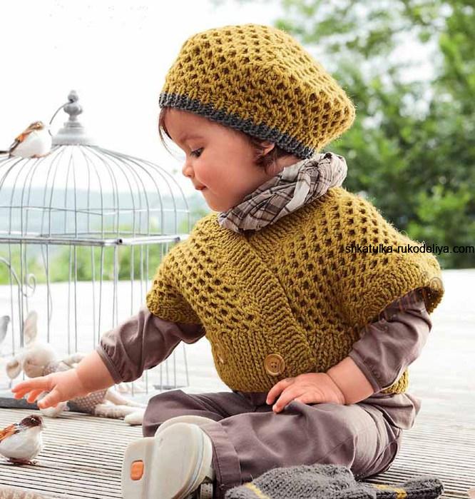 Комплект в осенних тонах спицами для девочки. Жилет и берет для прохладных дней для девочки спицами