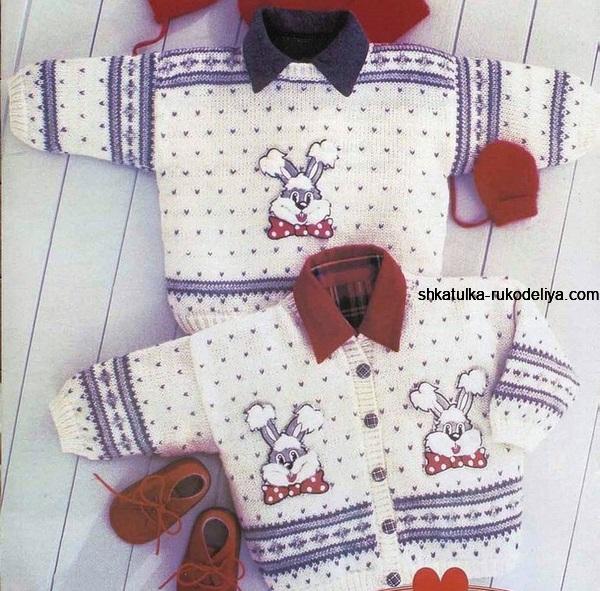 Жаккардовый пуловер с аппликацией спицами. Вязаный спицами пуловер для мальчика