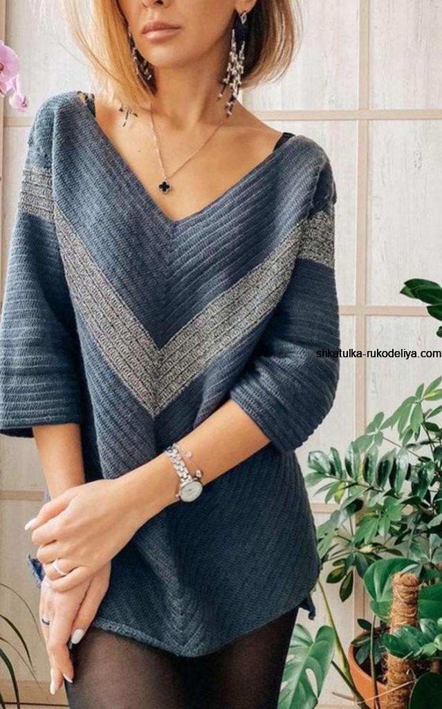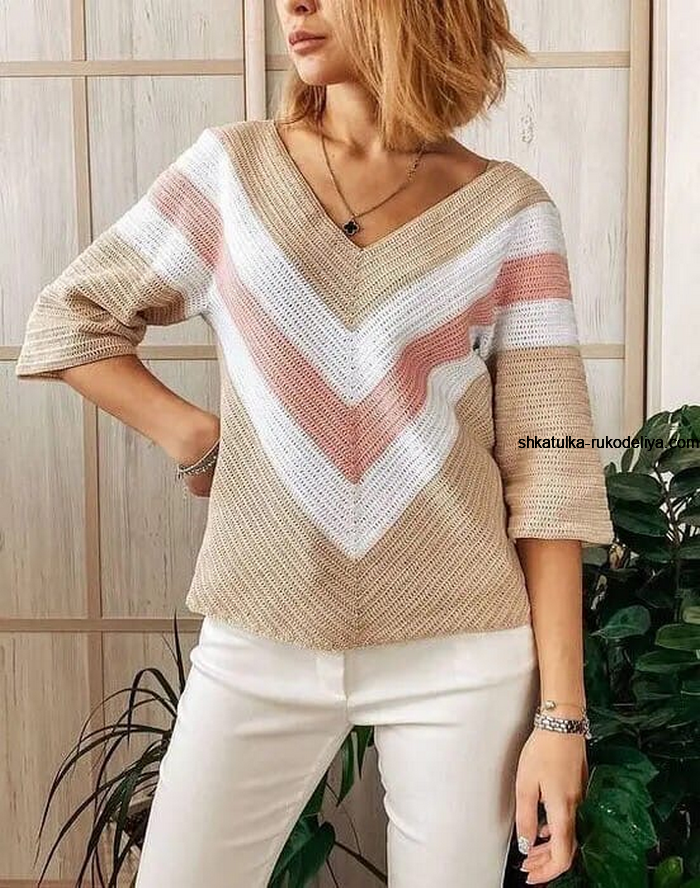 Вам понадобятся для джемпера: 1. Пряжа 400-500 м на 100гр Для XS – 350 гр Для S – 400 гр Для М – 500 гр Для L – 650 гр Для XL – 850 гр Граммы даны на общий вес джемпера с полосками, на каждую полосу из трех необходимо примерно для XS\S по 50 грамм пряжи, M\L\XL по 100 грамм. То есть в зависимости от количества полос нужно от общего веса джемпера отнять вес полос. Например, для XS (350 грамм) при трех полосках нужно отнять 50*3 = 150 гр. Получается 350-150=200 грамм основного цвета и по 50 грамм на 3 полосы. Для данного описания была использована пряжа 100%хлопок Деми 250м/50гр – вяжем в 1 нить Можно так же использовать 100% шерсть Сеам Merino Extra Fine 750м/50гр – вяжем в 2 нити. Крючок 1,5 – 1,75.
