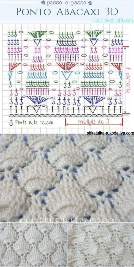 13-й ряд: 2 изнаночные, 5 петель вместе лицевой, 2 изнаночные, из одной петли вывязать 5 петель (1лицевая, 1 накид, 1лицевая, 1 накид, 1 лицевая) и т.д.