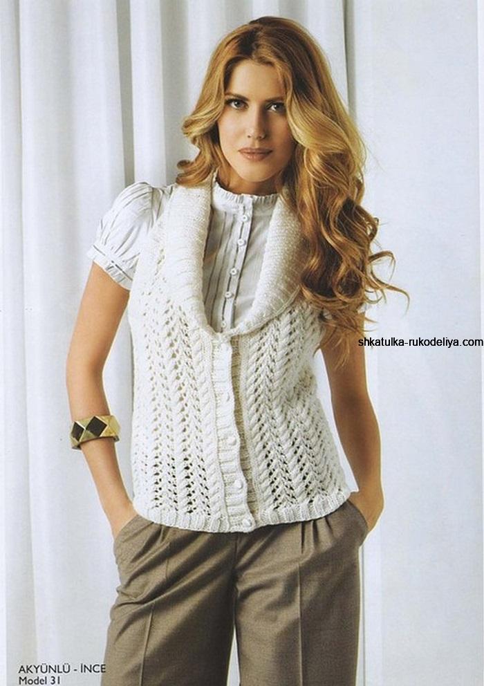 вязание спицами, жилетка, схема, описание, белая, женская, на пуговицах