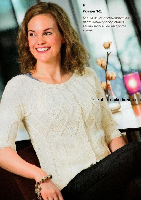 Белый жакет с рельефным узором спицами. Жакет с круглой кокеткой на пуговицах